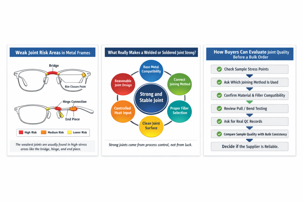 Weak joints are one of the most costly problems in metal frame production because they often stay hidden until the frame is under real stress. A frame may look acceptable during assembly, but if the bridge, hinge, or end piece has a weak welded or soldered connection, it can crack during fitting, shipping, or everyday wear. For wholesalers, distributors, and private label eyewear brands, that usually means returns, customer complaints, and damage to brand reputation. At eyewearbeyond, we have seen that joint failures are often blamed on “poor material,” while the real cause is more often poor process control, unsuitable filler material, excessive heat, or inconsistent inspection.